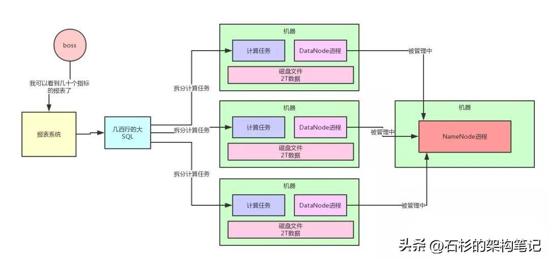 它由很多机器组成,每台机器上运行一个DataNode进程,负责管理一部分数据。