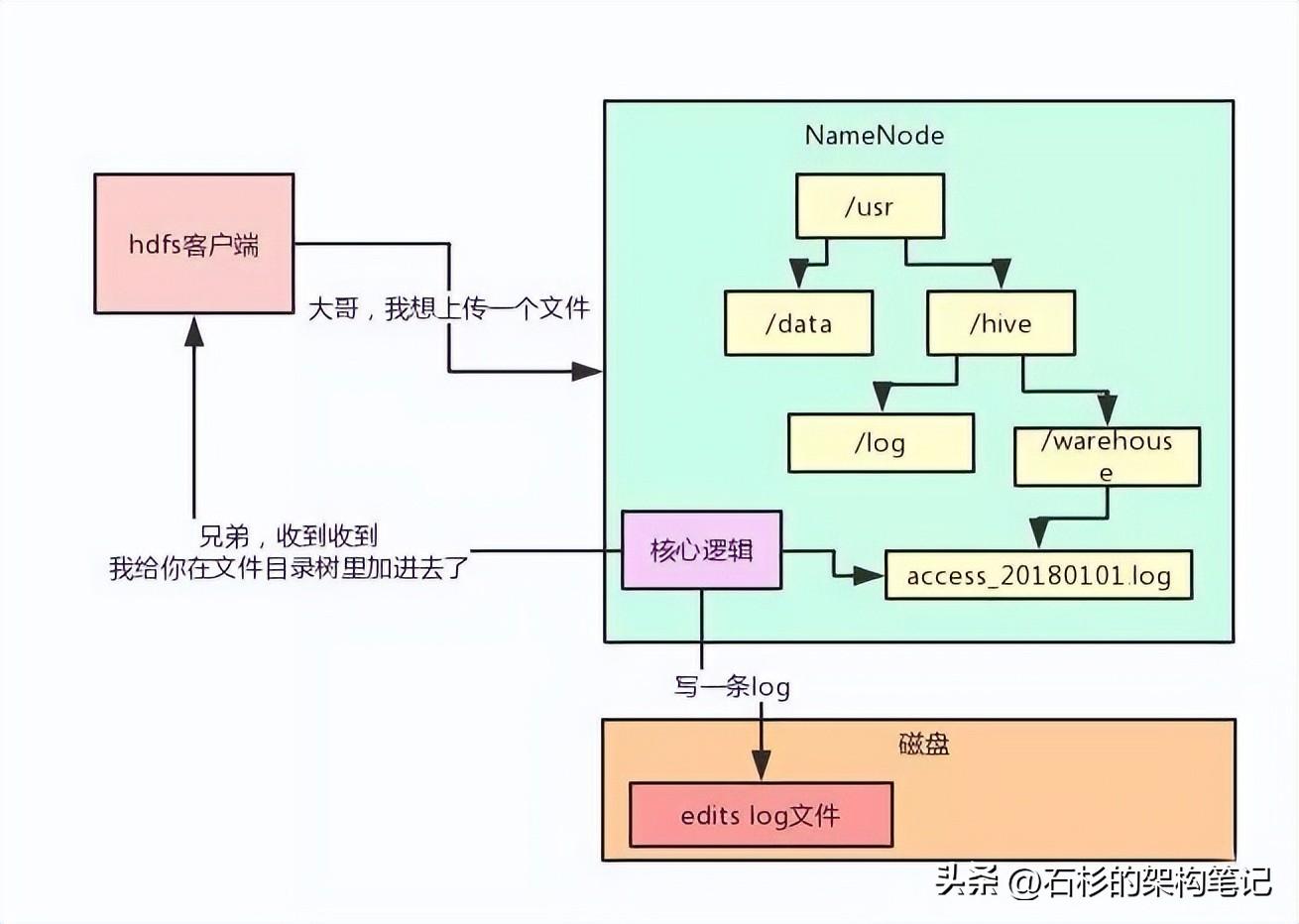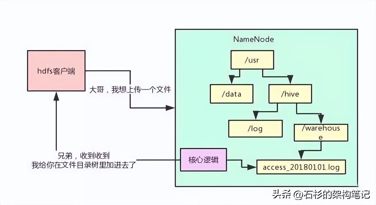 /usr/hive/warehouse/access_20180101.log”,大小是1TB,你看行不?然后NameNode就会在自己内存的文件目录树里,在指定的目录下搞一个新的文件对象,名字就是“access_20180101.log”。