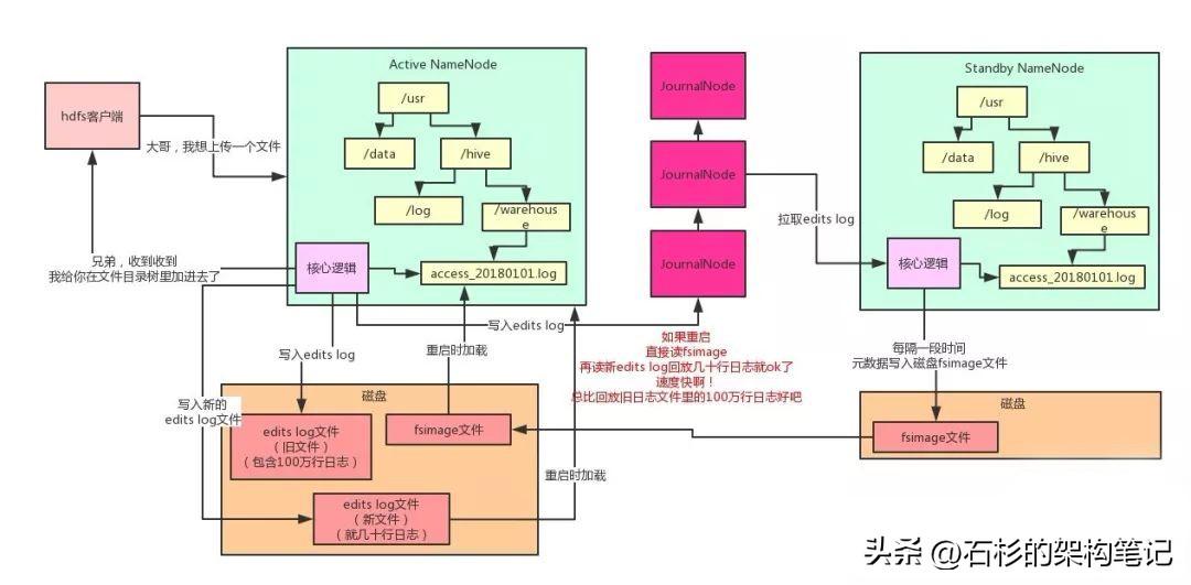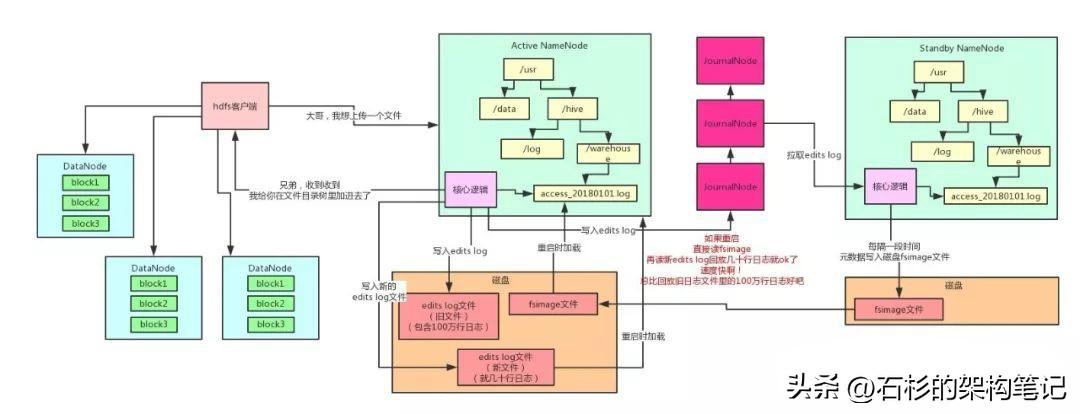 所以HDFS说,我可以这样子啊,我引入一个新的磁盘文件叫做fsimage,然后呢,再引入一个JournalNodes集群,以及一个Standby NameNode(备节点)。