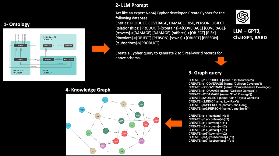 组织可以采用一种系统性的何使方法来生成知识图,方法是用大言模业数先摄取标准本体(比如保险风险),并使用GPT-3等大型语言模型(LLM)创建脚本以生成和填充图数据库。型语型和