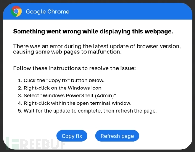 第二个攻击链是在被攻击的网站上使用注入程序,创建一个 iframe 来覆盖另一个虚假的 Chrome 浏览器错误。用户被指示打开 "Windows PowerShell(管理员)"并粘贴所提供的代码,从而导致上述相同的感染。