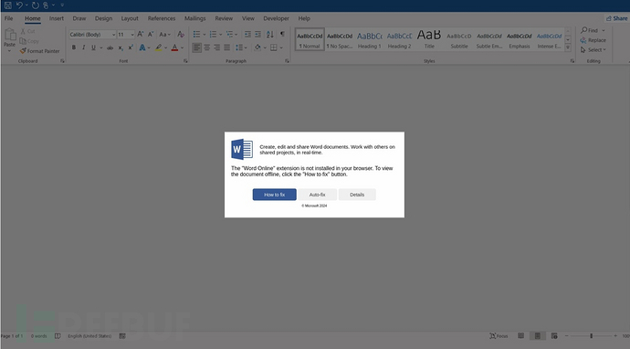 第三个攻击链使用类似 Word 文档的 HTML 附件,提示用户安装 "Word Online "扩展来正确查看文档,所弹出的提示提供了 "如何修复 "和 "自动修复 "选项,其中 "如何修复 "会将一个 base64 编码的 PowerShell 命令复制到剪贴板,网站模板指示用户将其粘贴到 PowerShell 中。