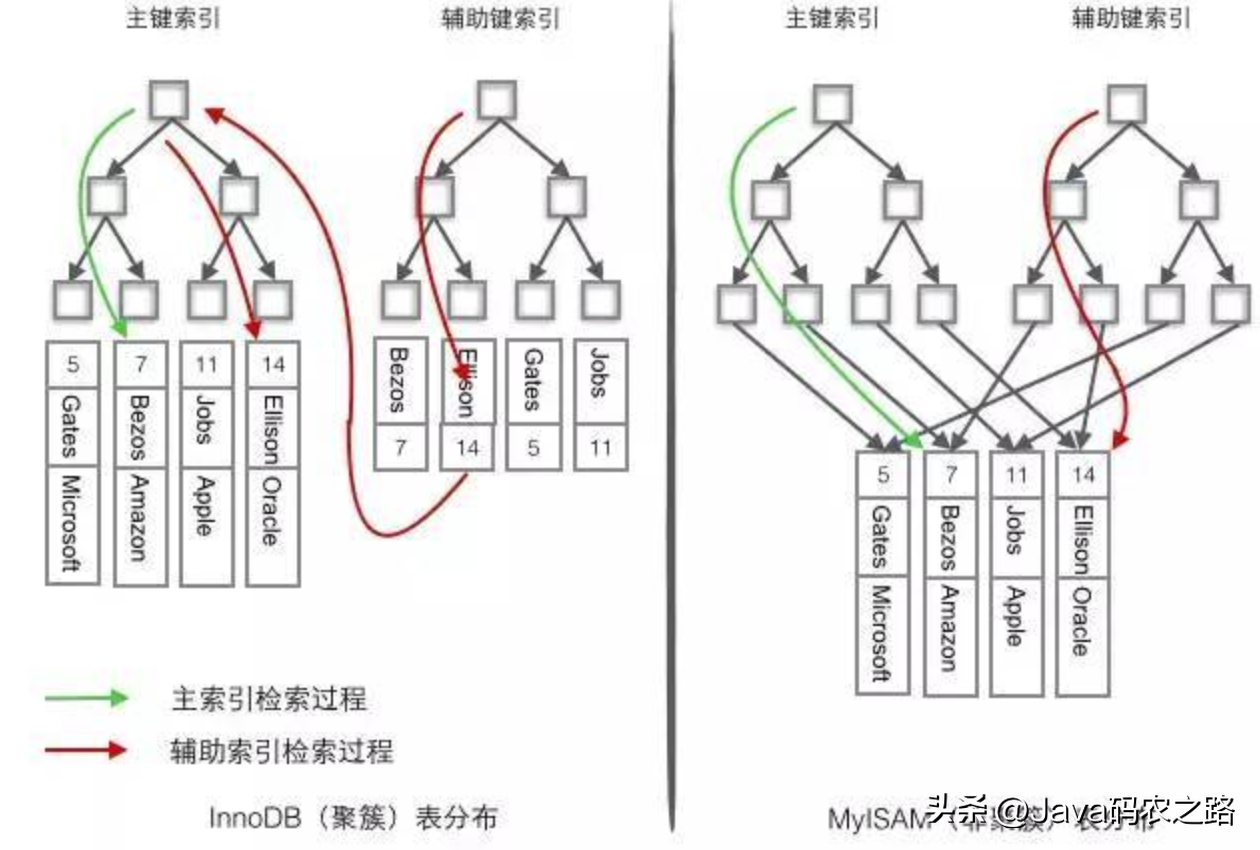 而非聚簇索引是将索引和数据分开存储,那么在访问数据的时候就需要2次查找,但是和InnoDB的非聚簇部分还是有所区别。InnoDB是需要查找2次树,先查找辅助索引树,再查找聚簇索引树(这个过程也叫回表)。而MyISAM的主键索引叶子结点的存储的部分还是有所区别。InnoDB中存储的是索引和聚簇索引ID,但是MyISAM中存储的是索引和数据行的地址,只要定位就可以获取到。