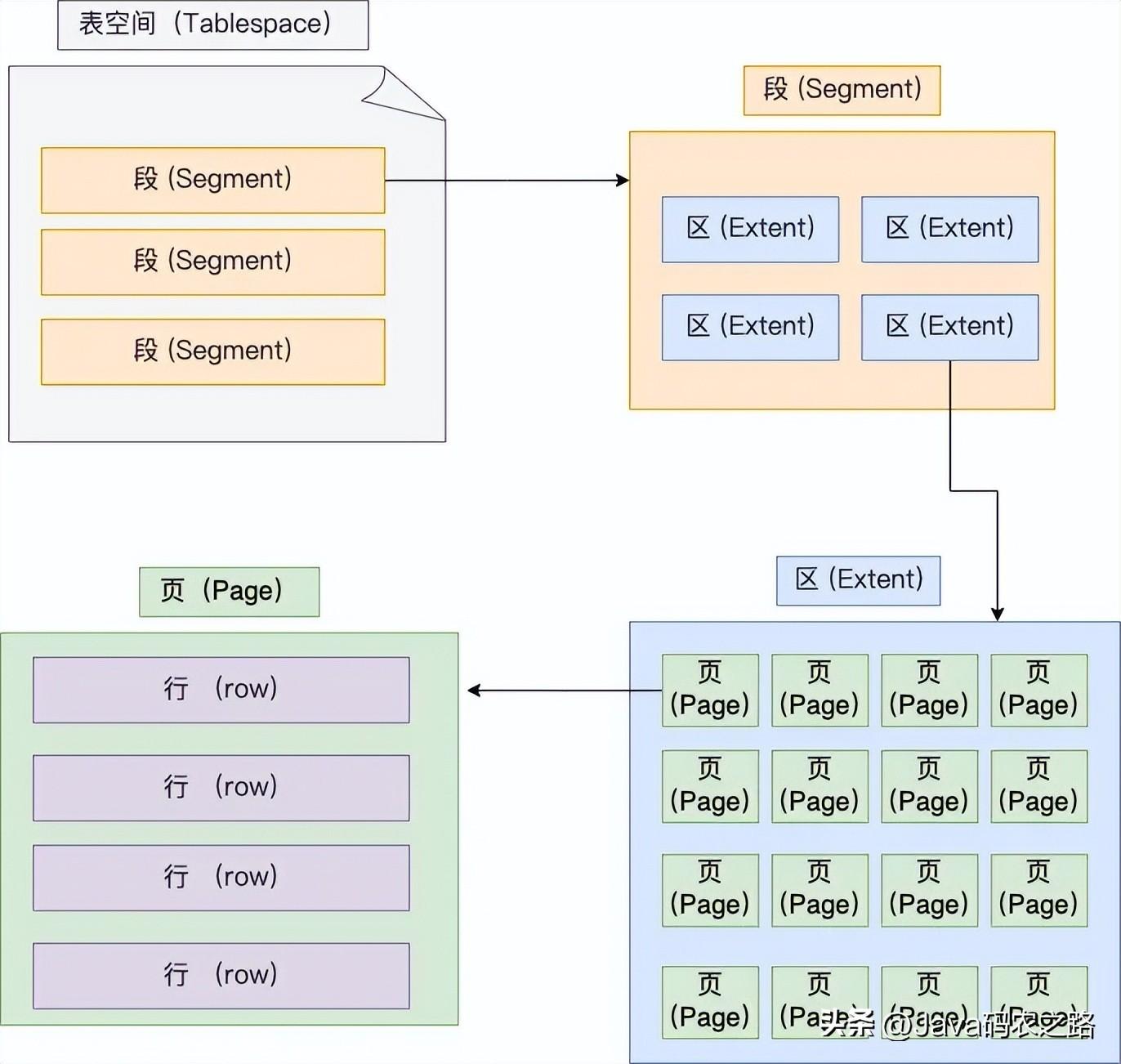 Segment(表空间) 是由各个段(segment)组成的,段是由多个区(extent)组成的。段一般分为数据段、索引段和回滚段等。
