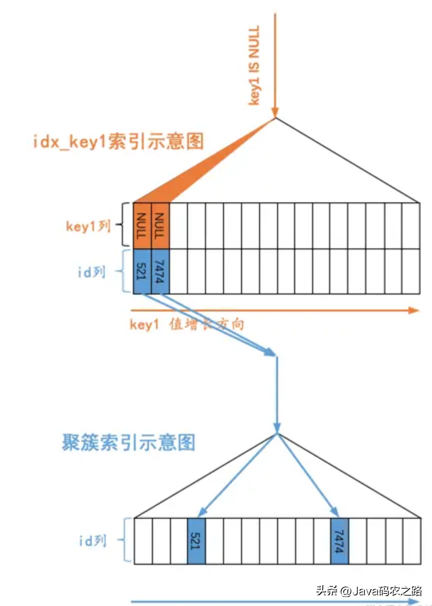 我们知道InnoDB引擎中按照物理存储的不同分为聚簇索引和非聚簇索引,聚簇索引也就是主键索引,那么是不允许为空的。那就不再我们本问题的讨论范围,我们重点来看看非聚簇索引,非聚簇索引是允许值为空的。
