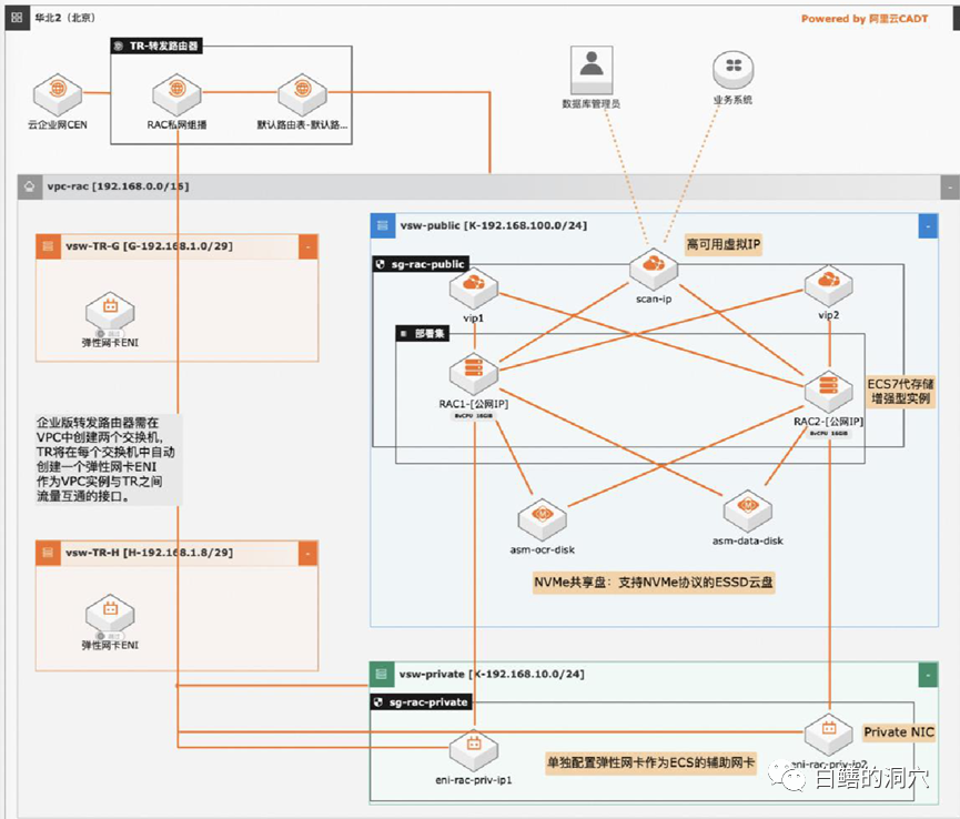 HAVIP:High Available Virtual IP Address,简称 HAVIP。阿里云虚拟网络实现的是基于二层的b2b信息网高可用 IP,通用、简单、易用。HAVIP 以 secondary ip 的形式存在网卡上,可以有单独的转发策略,通过 HAVIP 可以实现浮动 IP,适用于 HA 主备容灾或者双活高可用的场景;专有网络 VPC:基于阿里云创建的自定义私有网络, 不同的专有网络之间二层逻辑隔离,可以在自己创建的专有网络内创建和管理云产品实例,比如 ECS、负载均衡、RDS 等。在创建前,您需要结合具体业务,规划VPC 和交换机的数量及网段等;弹性网卡 ENI:弹性网卡 ENI(Elastic Network Interface)是一种可以绑定到专有网络 VPC 类型 ECS 实例上的虚拟网卡。通过弹性网卡,可以实现高可用集群搭建、低成本故障转移和精细化的网络管理。ECS 7 代存储增强型实例:能够提供高性能的数据库服务器,特点是IO延时较低,IOPS较高;ESSD 块存储:阿里云 ESSD(Enhanced SSD)云盘结合 25 GE 网络和 RDMA技术,提供单盘高达 100 万的随机读写能力和单路低时延性能,在此方案中ESSD块存储使用的是NVME共享盘作为底层磁盘资源;NVME共享盘:支持 NVMe 协议的 ESSD 云盘被称为 NVMe 共享盘。NVMe 共享盘支持多 ECS 实例并发读写访问,具备高可靠、高并发、高性能等特点。为 ECS实例提供了多实例挂载和 IO 拦截功能。共享盘是为了RAC的多实例并发读写共享存储;云企业网 CEN:云企业网(Cloud Enterprise Network,简称 CEN)是阿里云提供的一款能够快速构建混合云和分布式业务系统的全球网络服务,为用户提供优质、高效、稳定的网络传输环境,帮助用户打造一张具有企业级规模和通信能力的云上网络。适用于集团企业、全球网络等场景;l转发路由器 TR(Transit Router):提供连接网络实例、自定义路由表、添加路由条目、添加路由策略等丰富的网络互通和路由管理功能;该功能可以与CEN结合,实现Oracle RAC的INTERCONNECT 多播网络;
