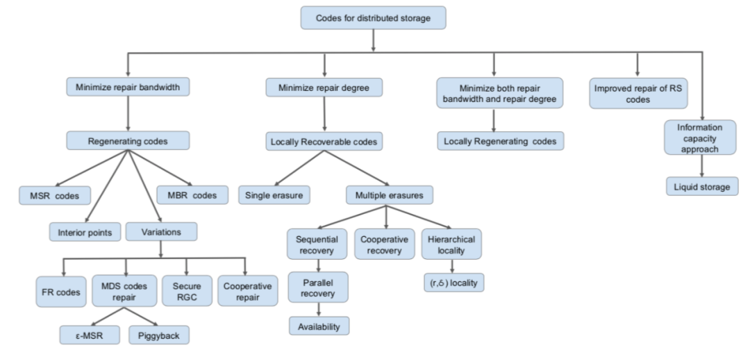 Reed I S, Solomon G. Polynomial Codes over Certain Finite Fields. Journal of the society for industrial and applied mathematics, 1960, 8(2):300-304Plank J S, Ding Y. Note: Correction to the 1997 tutorial on Reed-Solomon coding.Software: Practice and Experience, 2005, 35(2):189-194Shokrollahi A. LDPC codes: An Introduction. Technical report, 2003.Blaum M, Brady J, Bruck J, et al. EVENODD: An Efficient Scheme for Tolerating Double Disk Failures in RAID Architectures. IEEE Transactions on computers (TOC), 1995, 44(2):192-202.Corbett P, English B, Goel A, et al. Row-diagonal Parity for Double Disk Failure Correction. in: Proceedings of The 2nd USENIX Conference on File and Storage Technologies (FAST04), Berkeley, CA, USA, March 31 - April 2, 2004, 1-14.Huang C, Xu L. STAR: An Efficient Coding Scheme for Correcting Triple Storage Node Failures. IEEE Transactions on Computers (TOC), 2008, 57(7):889-901.James S. Plank: The RAID-6 Liberation Codes. FAST 2008: 97-110I. Tamo, Z. Wang, and J. Bruck, “Zigzag codes: MDS array codes with optimal rebuilding,” IEEE Trans. Inf. Theory, vol. 59, no. 3, pp. 1597–1616,2013.Blaum M, Roth R, New array codes for multiple phased burst correction. IEEE Trans on Inform Theory, 1993,39(1): 66 ~ 77.A. Dimakis, P. Godfrey, Y. Wu, M. Wainwright, and K. Ramchandran, “Network coding for distributed storage systems,” IEEE Trans. Inf. Theory,vol. 56, no. 9, pp. 4539–4551, Sep. 2010.M. N. Krishnan and P. V. Kumar, “On MBR codes with replication,” in Proc. IEEE International Symposium on Information Theory, Barcelona, Spain, 2016, pp. 71–75.N. B. Shah, “On Minimizing Data-Read and Download for Storage-Node Recovery,” IEEE Communications Letters, vol. 17, no. 5, pp. 964–967, 2013.K. Rashmi, N. Shah, P. Kumar, and K. Ramchandran, “Explicit construction of optimal exact regenerating codes for distributed storage,” in Proc. 47th Annu. Allerton Conf. Communication, Control, and Computing, Urbana-Champaign, IL, Sep. 2009, pp. 1243–1249.K. V. Rashmi, N. B. Shah, and P. V. Kumar, “Optimal Exact-Regenerating Codes for Distributed Storage at the MSR and MBR Points via a Product-Matrix Construction,” IEEE Trans. Inf. Theory, vol. 57, no. 8, pp. 5227–5239, 2011.Y. Hu, H. C. H. Chen, P. P. C. Lee, and Y. Tang, “NCCloud: applying network coding for the storage repair in a cloud-of-clouds,” in Proc. 10th