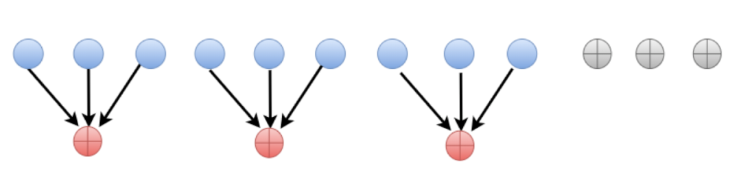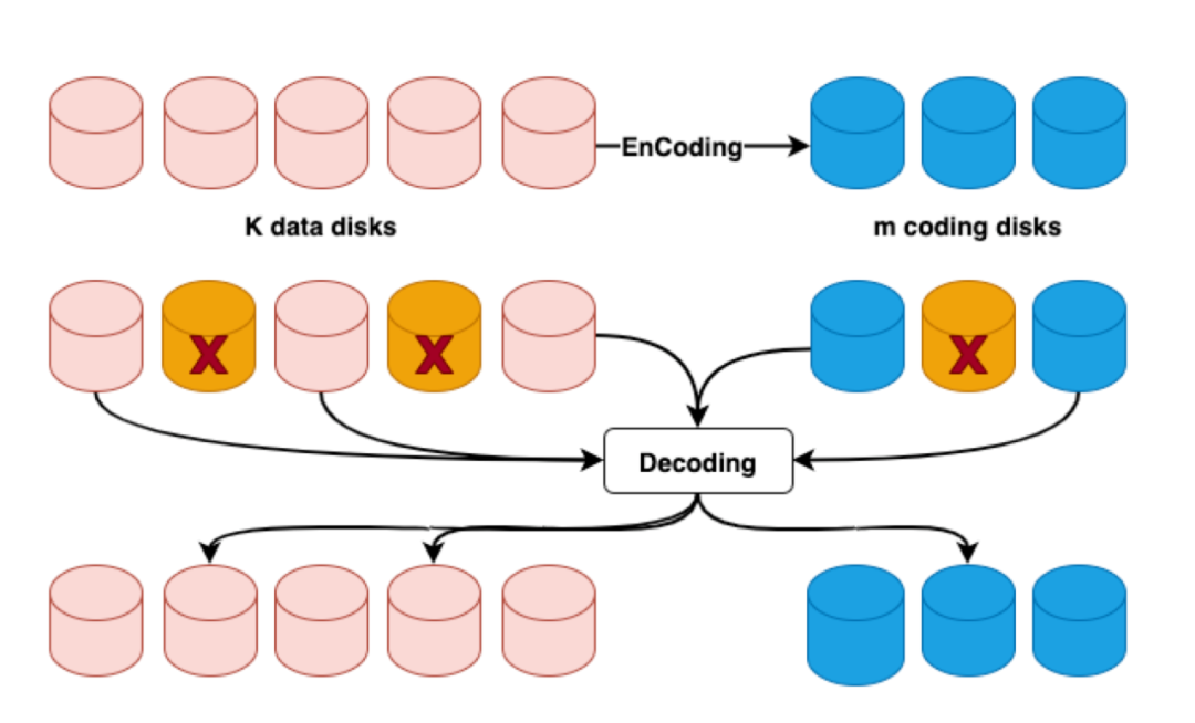 纠删码通用由两个参数n和k来进行配置,称为(n,k)编码。在分布式系统当中,通常将数据以固定大小的块进行组织,编码时,存储系统将k个数据块进行编码生成额外的n-k = m个大小相同的校验块,这样n个数据块和校验块中有任意的磁盘节点故障,都可以通过其它的磁盘节点进行解码恢复丢失的数据。以下为纠删码的一个示意图: