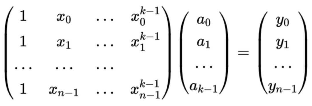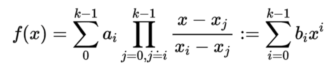 RS码基本思想其实就是拉格朗日插值多项式,我觉得用拉格朗日插值多项式来推导RS码相对于其它文献的讲解会更清晰,下面我们简单回顾一下拉格朗日插值多项式:对于任何k阶的多项式函数f(x)=a0+a1x+a2x^2+...+akx^k,我们很容易通过任意的n+1个点(x0, f(x0),(x1,f(x1)),... (xk,f(xk))对这个多项式进行恢复。