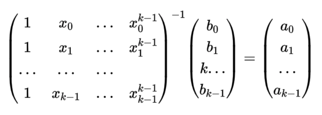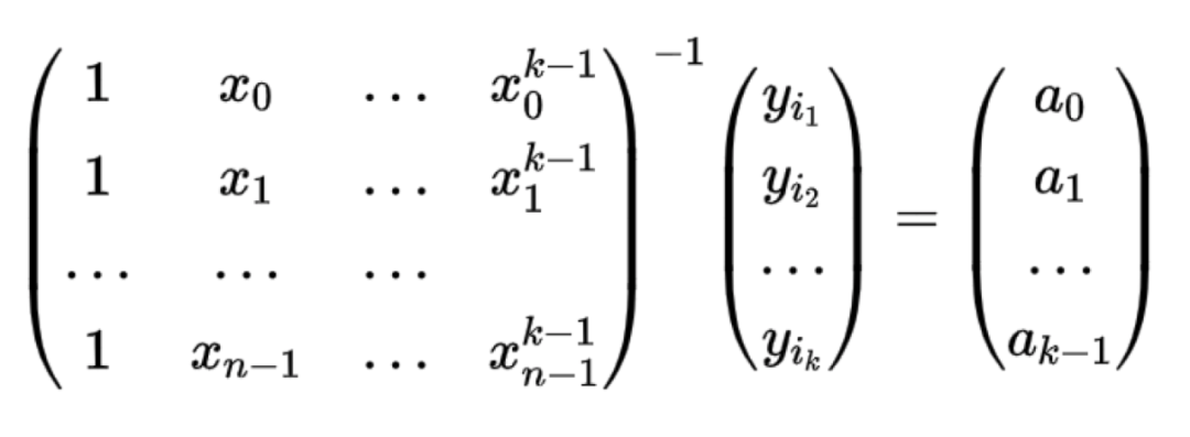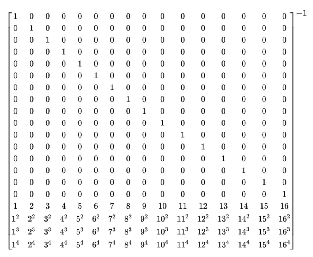 令上式的范德蒙德矩阵的逆*a向量 = b向量,则校验矩阵有如下: