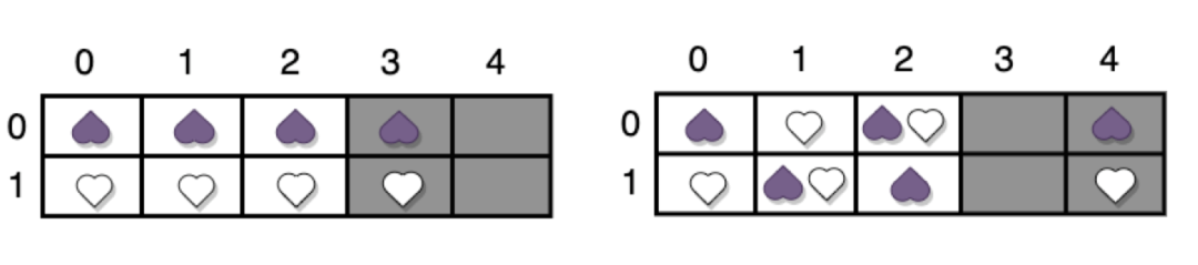 MDS阵列码是一类比较特殊的线性分组码。阵列码相对于RS码避免了有限域计算,仅通过异或运算实现纠删码。在这类码中,符号均为m维的列向量,从而每个码字都是一个m*n的二维阵列。绝大部分的阵列码都是二元阵列码,阵列码的每一列可以全是数据位也可以既有数据位也有校验位。以下为一个m=2, n = 5, k = 3的阵列码的示意图:
