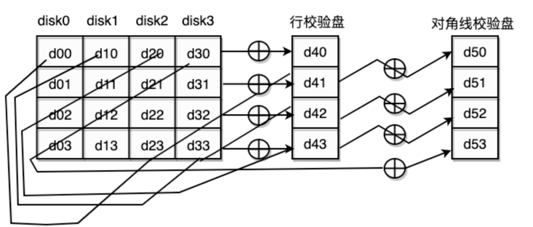 RDP码的码字结构与EVENODD码非常类似,只是比EVENODD码少了一个数据列,是一个(m-1)*(m+1)阵列码,其中m是一个素数。RDP相对于EVENODD编解码复杂度都要低不少,因此在RAID应用广泛。