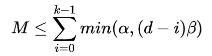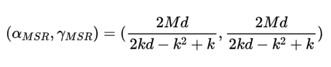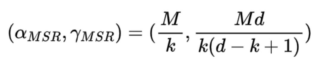 MSR全称为最小存储再生码Minimum Storage Regenerating码,不难理解,MSR是保证了存储消耗最小,所以MSR的存储数据块大小和失效修复带宽值计算公式如下: