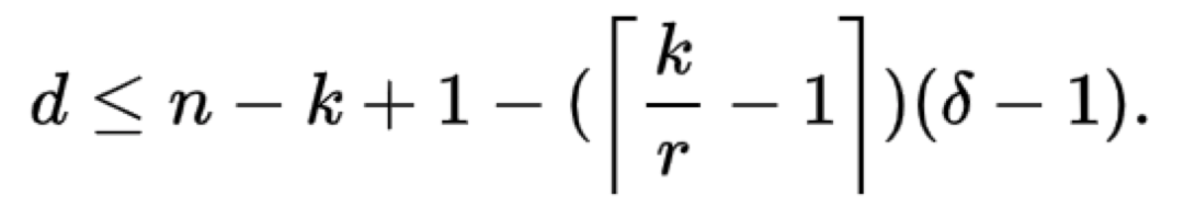 针对于一个(n,k,r)的局部修复码,即码长为n的码中有k个信息位和具有局部修复性r,则有一个经过证明的该码的最小距离d(C)满足上界如下: