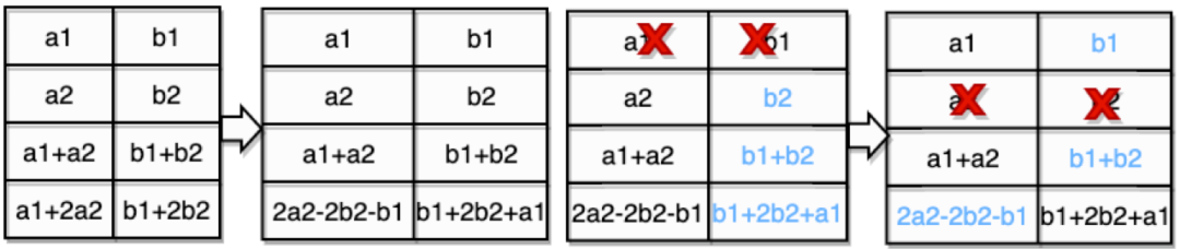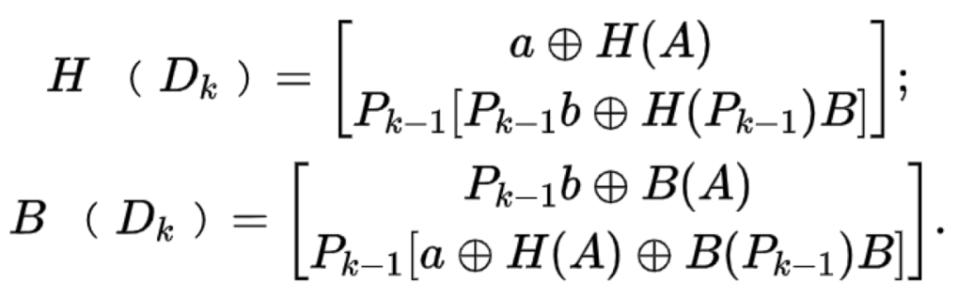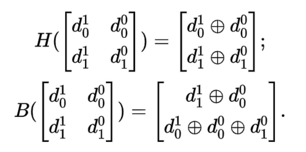 其中,A,B是2^(k-2) * (k-1)的bit矩阵,a,b则是一个包含2^(k-2)个元素的列向量。如果把 butterfly编码后的码字记为:Ck = (Dk−1 k ,...,D0 k ,H,B),则不难看出,H,B分别带为butterfly后的一个水平校验列和butterfly校验列。H,B的生成遵循如下递归准则: