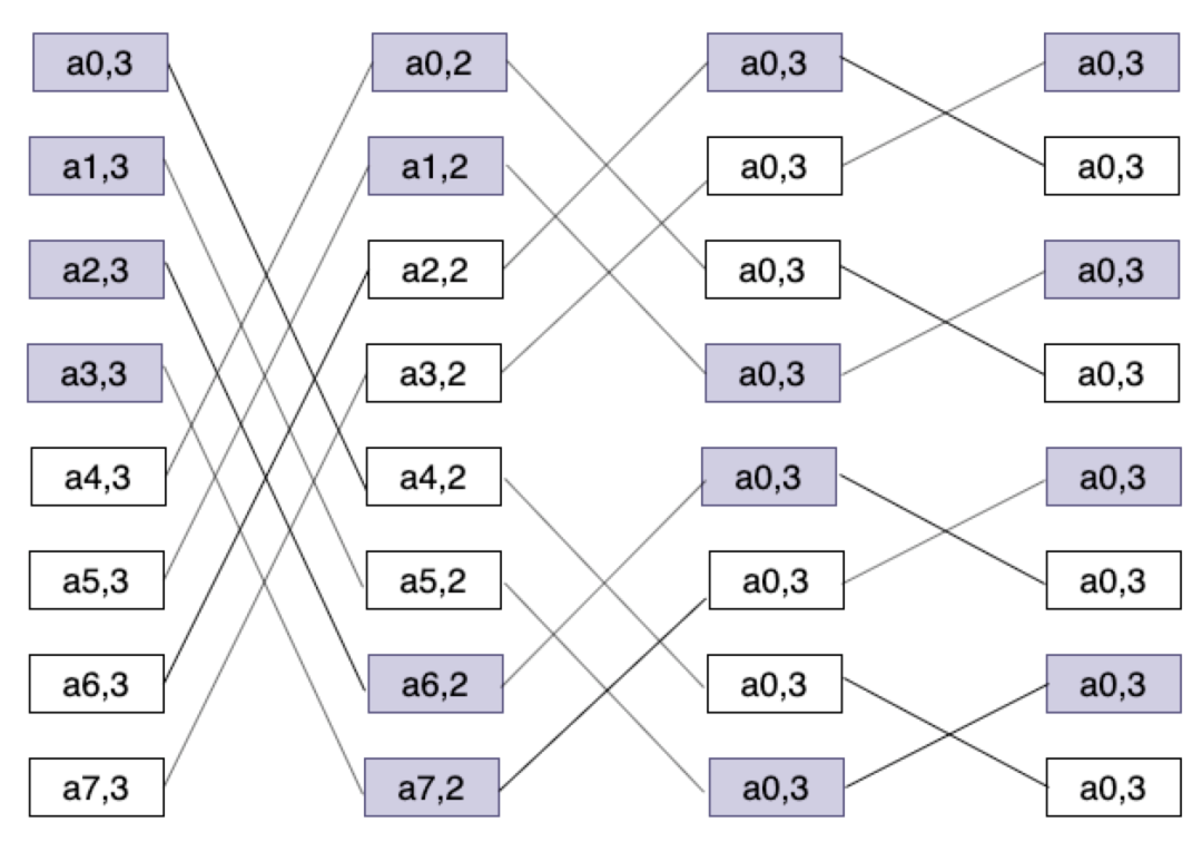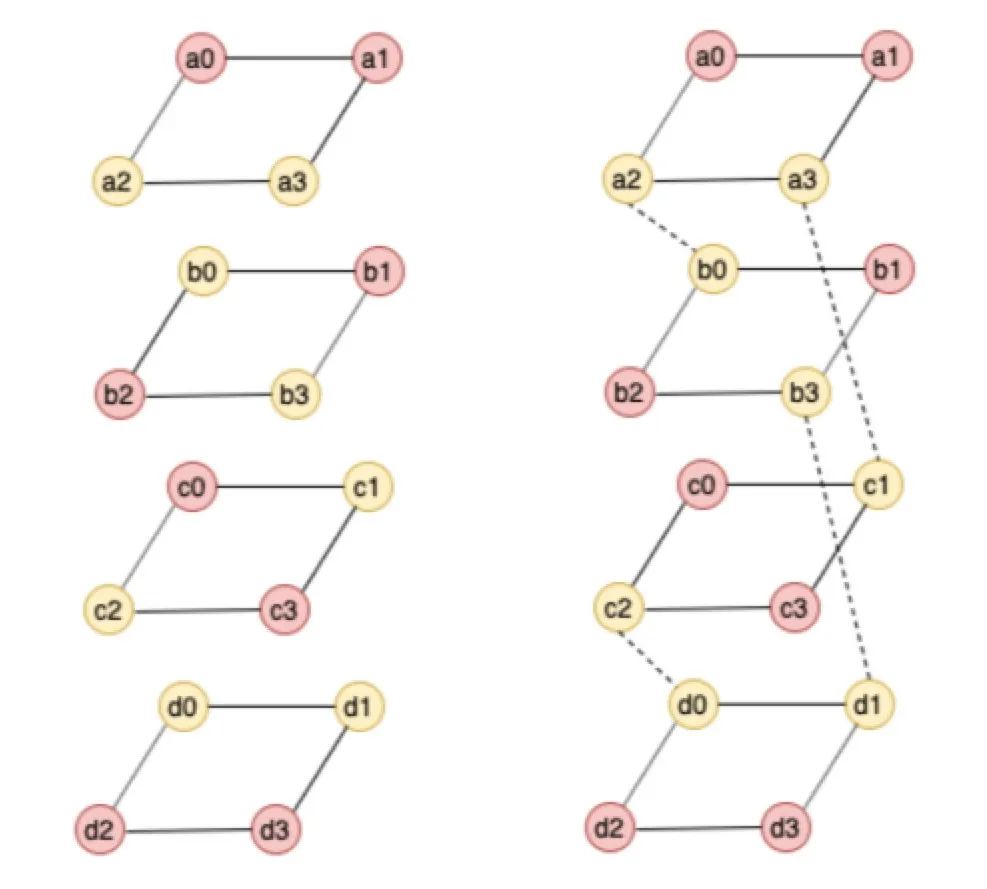 3.3 MSR:Butterflybutterfly是FAST 2016年的一篇论文提出的编码算法,最多可校正2个节点故障的数据丢失,算法只涉及XOR操作,性能较好。节点故障后只需要所有节点的1/2数据参数修复。由于编码操作用线相连对应符号位看起来像蝴蝶一样,如下图所示,所以取名butterfly code。