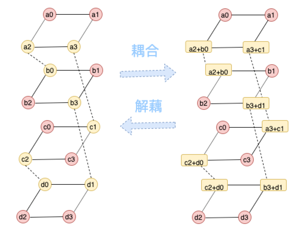 图中被耦合的数据用黄色表示,耦合关系如上图右虚线表示,黄色数据块存储的是耦合之后的数据,也就是不再是系统码,相当于解码需要进行解耦合才能得到原始数据。