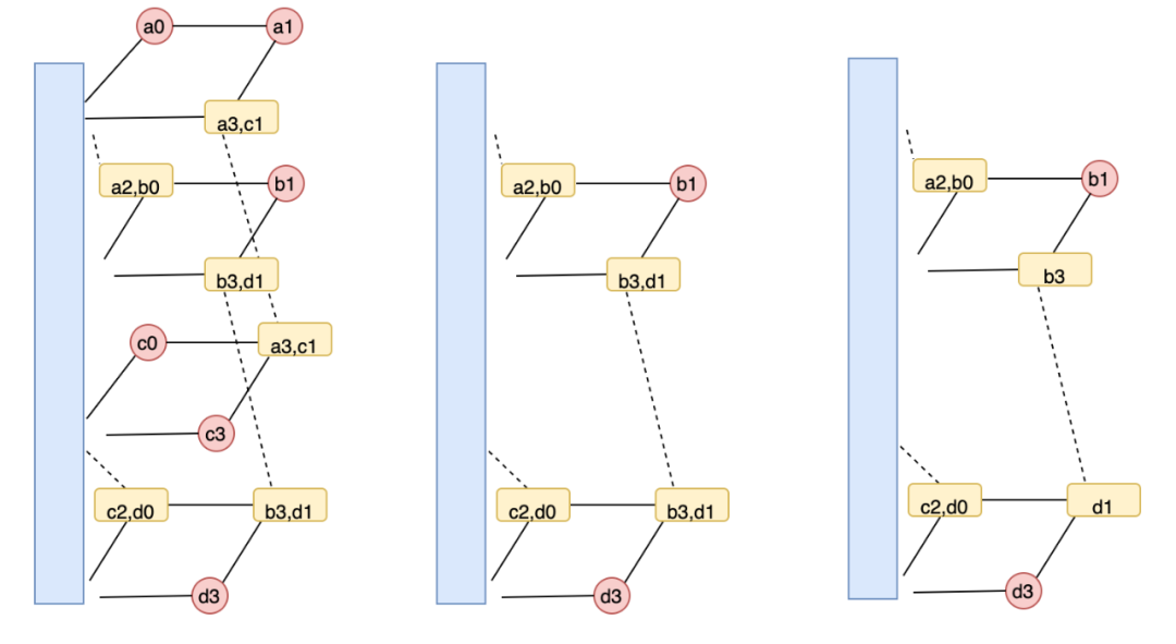 两个耦合的数据块(b_3,d_1) 和[b_3, d_1] 解耦得到b3 和d1,如上图(右);第二层通过b1,b3 的MDS 解码得到b_0, b_2,第四层MDS 解码得到d_0,d_2;利用第二层中[a_2, b_0] 和步骤2 得到的b_0 得到a_2,同理得到c_2。简单推导可以发现其他三个节点也可以以最小开销完成数据修复。