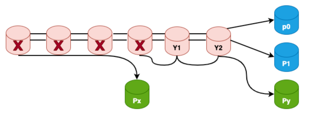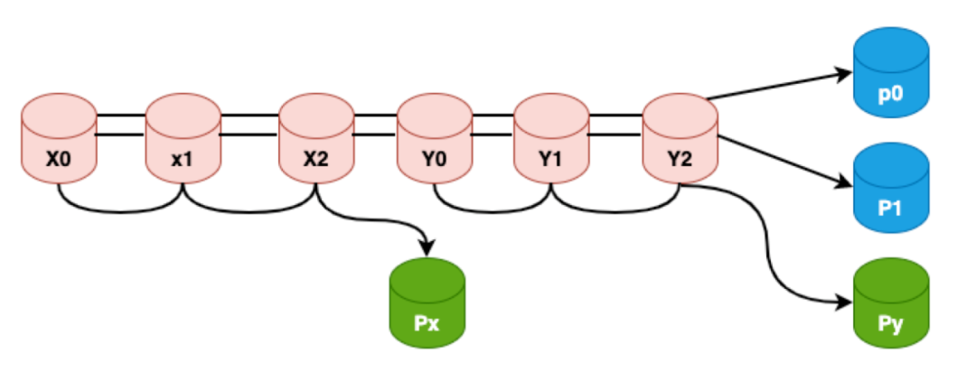 如上图所示px,py为局部校验节点,p0,p1为全局校验节点,不难看出,虽然LRC有4个校验节点,但是LRC不满足MDS性质,比如x0,x1,x2,px 4个节点全都故障,LRC无论如何校造都是无法恢复的,因为全局校验节点只有2个,而py和x0,x1,x2无关,所以无论如何都恢复不出来x0,x1,x2这三个数据节点,这种故障也称为信息论无法解码故障;虽然LRC不能容忍这种场景的4个节点故障,但是如果LRC构造得好,是可以达成其它场景的4个节点的故障,比如下图所示: