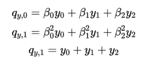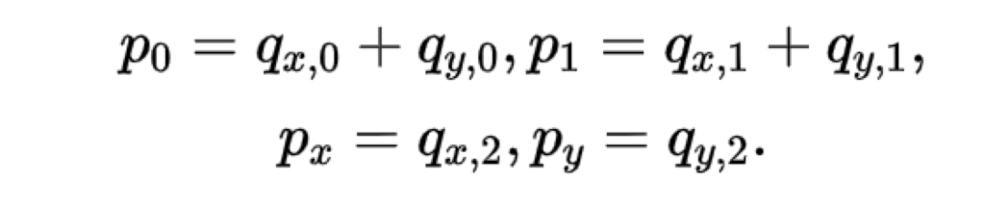 a图是x0,x1,p1三个节点故障,b图是x0,x1,y0,y1四个节点故障,这类故障是有可能重建的也称为信息论可解码故障。那么LRC的研究就是设计合理的编码方式来尽可能的覆盖所有信息论可解码故障场景,当LRC的构造方式覆盖了所有信息论可解码场景则称LRC码符合Maximally Recoverable(MR)性质。 (6,2,2)的校验位构造方程如下: