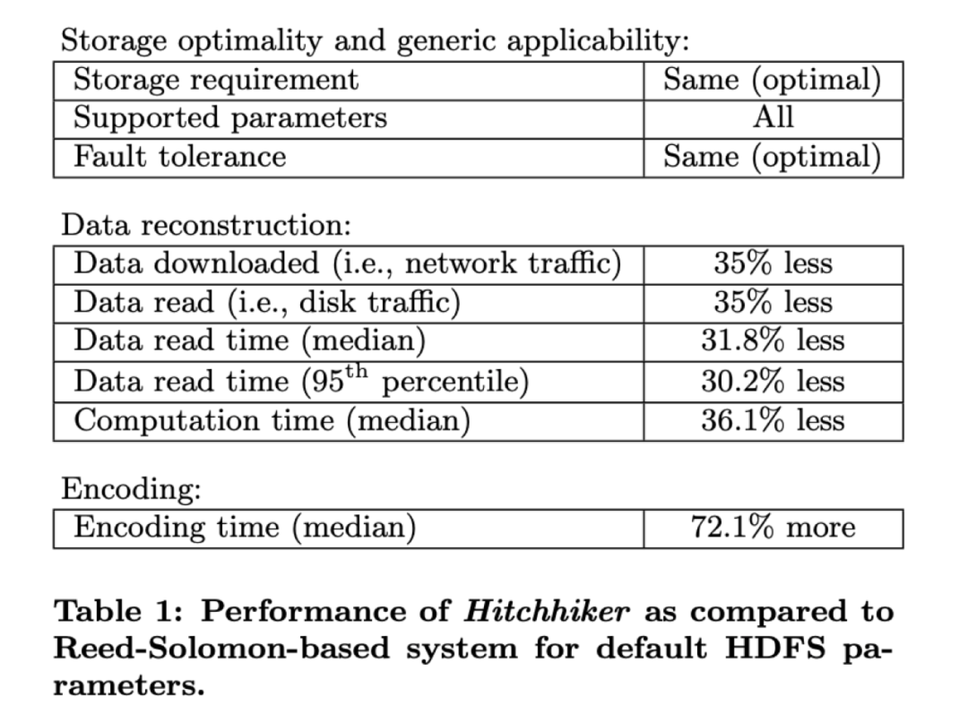 3.6 piggyback:Hitchhikerpiggyback框架的一个典型的工业界的应用实践场景是facebook在2014年提出的,当时facebook的f4系统原本也是用(10,4)RS纠删码来降低冗余度,但是RS码的修复带宽非常高,据当时统计数据,facebook一个PB级的集群中因为节点恢复所需要消耗的网络带宽达到了180TB。所以facebook针对冷存集群提出了一种基于piggyback框架的Hitchhiker编码来降低修复带宽。