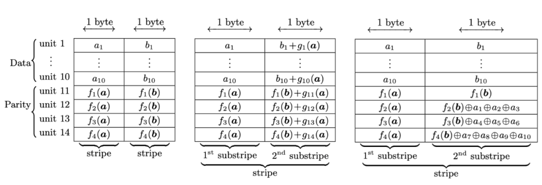 而当7-10有一个节点故障时,则需要通过14个byte进行恢复,原因是第2个子条带的第4个校验单元是由a7,a8,a9,10四个组合,其中有一个失效,需要引入第1个子条带的3个单元才能进行恢复。