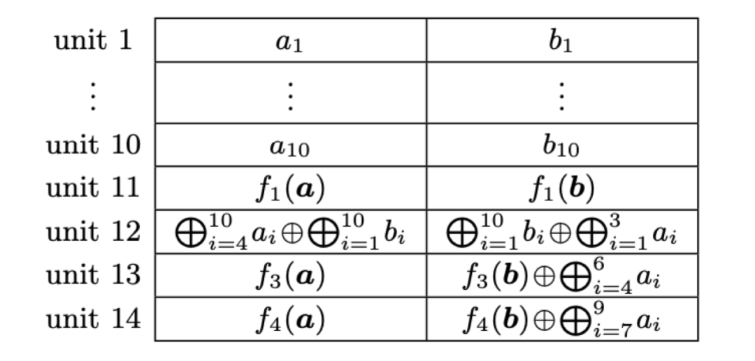 针对Hitchhiker-XOR算法,可以看到在第7-10节点故障时需要14个Bytes进行修复,XOR+通过对RS码进行适当限制来降低这一部分的开销,限制条件如下:4个校验单元的函数f需要有一个满足:ALL-XOR性质,也就是子条带数据全部进行异或操作的同时满足MDS性质。通过该限制,则两个子条带的校验单元的编码方式如下图所示: