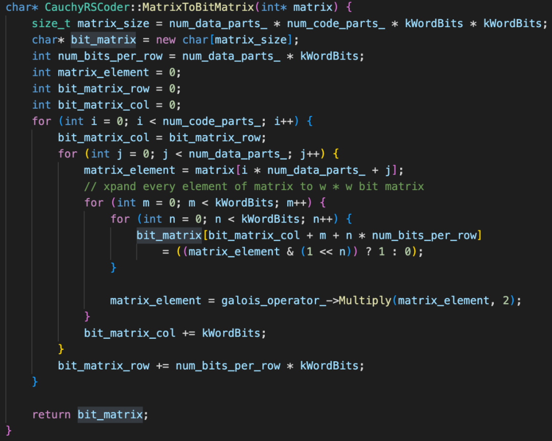 所以基于Cauchy矩阵的RS编码方案可以优化为bit-matrix为生成矩阵,原有的有限域上的乘法和加法也变成了有限域的“与运算”和“XOR”运算,从而提高编码效率。