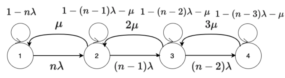 初始状态为1状态,1状态为n块磁盘都没有故障的概率为1-n* ramda,从状态1转移到状态2则是有n*ramda概率,状态2恢复到1状态则由u决定,状态2转移到状态3的概率为1-(n-1)* ramda,则不难计算出维持2状态的概率如上图所示: