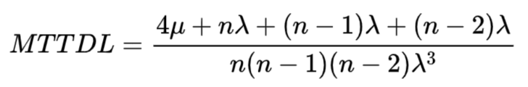 本文不对马尔科夫链状态转移进行详细推导,仅给出最终的MTTDL的简化版计算公式如下:
