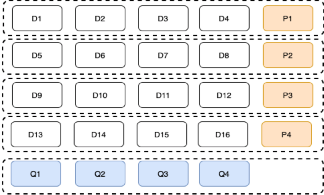 当只有一个数据节点故障情况下,通过在各机房的局部校验块,只需要在机房内用MSR最小带宽进行快速修复;当只有一个局部校验节点故障下,也是通过在各机房的数据块在机房内进行快速修复;当只有一个全局校验节节点故障下,则可以通过一个机房的局部校验块再结合其它机房的中间结果数据进行并行恢复;条带越宽,带宽节省越多,比如单机房12数据块,3机房可节省跨机房带宽80%+;当有两个或两个以上节点同时故障的情况下,才需要进行跨机房传输数据修复,我们可以通过局部校验块+其它机房中间结果结合+并行修复的形式来降低网络带宽消耗。为了能描述清楚我们的策略,我们以(16,4,4)4机房,4个局部校验块,4个全局校验块,16个数据块【如下图所示】为例来说明: