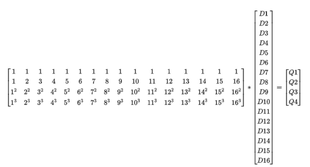 同样按RS码构造方式,我们假设Q1、Q2、Q3、Q4的构造按如下所示:
