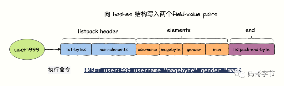 Hashes 数据类型使用 listpack 作为存储数据时的情况,服务器租用如图 2-19 所示。