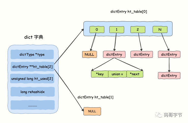 复制typedef struct dictEntry { void *key; union { void *val; uint64_t u64; int64_t s64; double d; } v; struct dictEntry *next; } dictEntry;1.2.3.4.5.6.7.8.9.10. *key指针指向键值对中的键,实际上指向一个 SDS 实例。v是一个 union 联合体,表示键值对中的值,同一时刻只有一个字段有值,用联合体的目是节省内存。*val 如果值是非数字类型,那就使用这个指针存储。uint64_t u64,值是无符号整数的时候使用这个字段存储。int64_t s64,值是有符号整数时,使用该字段存储。double d,值是浮点数是,使用该字段存储。*next指向下一个节点指针,当散列表数据增加,可能会出现不同的 key 得到的哈希值相等,也就是说多个 key 对应在一个哈希桶里面,这就是哈希冲突。Redis 使用拉链法,也就是用链表将数据串起来。MySQL:“为啥 ht_table[2] 存放了两个指向散列表的指针?用一个散列表不就够了么。”