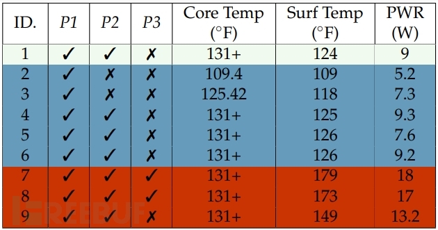 研究人员使用三星 Galaxy S8手机进行了实验,在注入CE包增加功率后,手机温度迅速升高。不久之后,由于过热,手机试图通过传输 EPT 数据包来停止电力传输,但电压操纵器引入的电压干扰破坏了这些数据包,服务器租用导致充电器无响应,并受到虚假CE、RP报文的误导,不断传输功率,温度进一步升高。接着,手机进一步激活了更多保护措施:关闭应用程序,并在 126 F°(52.2℃) 时限制用户交互。当温度来到170F°(76.7℃)时手机启动了紧急关机。尽管如此,电力传输仍在继续,且温度维持在危险的 178F° (81℃)。