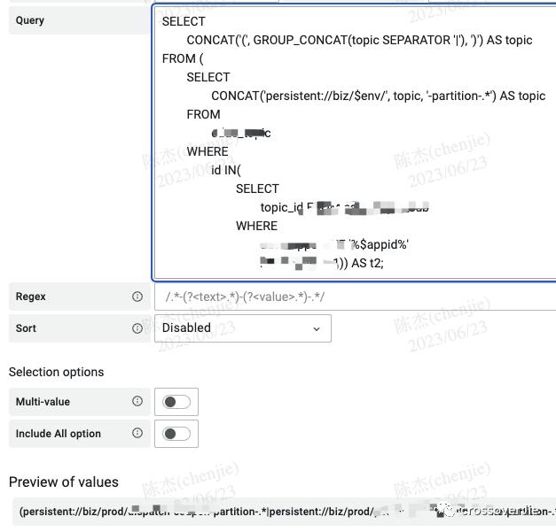 原来是选择所有 topic 后 grafana 会~~~~自动对参数转义,这个我查了好多资料包括咨询 ChatGPT 都没有得到解决。淫巧