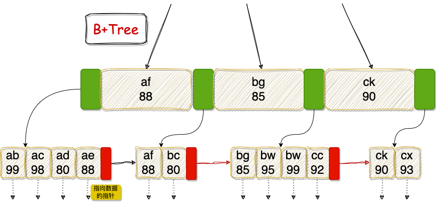 B+Tree 叶子节点的关键字从小到大按顺序排列,左边结尾数据都会保存右边节点开始数据的指针(红色区域),这个指针在范围搜索的时候非常有用,例如想搜索姓名在 ac~bc 之间的数据,按照树找到第一个节点 ac 之后,顺着指针一直往后找,找到第一个不满足条件的数据结束。如果是 B-Tree 则没有 ac 指向 bc 的指针,需要先回到分支节点 af 再继续向下搜索,效率就会低很多。